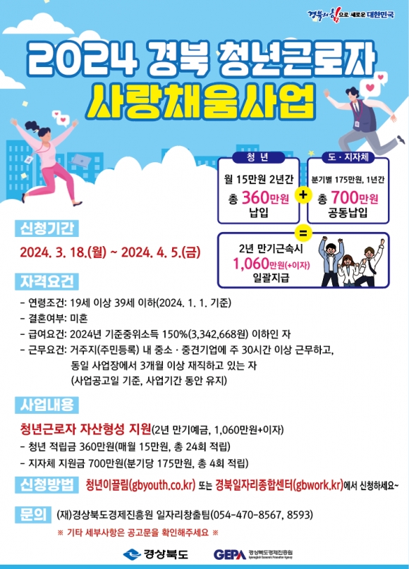 경북도는 이번 달 18일부터 4월 5일까지 ‘청년근로자 사랑채움사업’ 신청자를 모집하고 최종 135명을 선정한다. 선정된 청년이 2년간 월 15만 원씩 총 360만 원을 저축하면 경북도와 시군에서 공동으로 1년간 분기별 175만 원씩 총700만 원을 추가 적립해 만기 시 1,060만 원을 수령한다.
