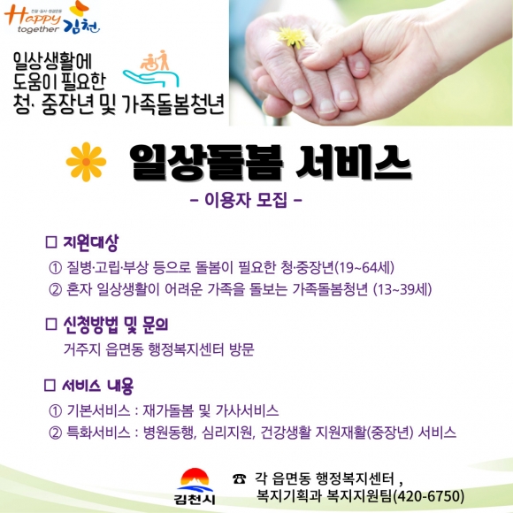 일상돌봄 서비스는 질병・부상・고립 등으로 생활에 도움이 필요한 청・중장년(19~64세)과 가족을 돌보거나 생계를 책임지는 가족 돌봄 청년(13세~39세)을 대상으로 재가 돌봄․가사서비스, 병원 동행, 심리지원, 건강생활 지원 재활 등 수요자 중심의 서비스가 제공되며, 이용 서비스 및 소득수준에 따라 본인부담금이 발생한다.