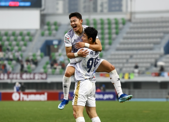 | ↑↑ 30일 4R 수원전에서 득점에 성공한 이중민이 정치인과 기쁨을 나누고 있다 |