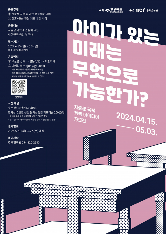 이번 공모는 ‘아이가 있는 미래는 무엇으로 가능한가?’를 주제로 전 국민 누구나 참여 가능하며, 이달 15일부터 5월 3일까지 진행된다. 경상북도 홈페이지 공고문(이메일) 또는 포스터 QR코드를 통해 온라인으로 접수하면 된다.