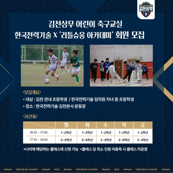 한편, 김천상무 ‘리틀슈웅 아카데미’는 김천시 지역 내 초등학생과 한국전력기술 임직원 자녀 중 유치원생 및 초등학생을 대상으로 운영되며, 한국전력기술 김천 본사 운동장에서 수업을 진행한다.