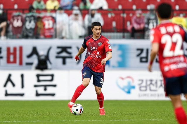 | ↑↑ 지난 5일 인천전에서 김천상무 김민덕이 프로통산 100경기 출전을 달성했다(김천상무 제공) |