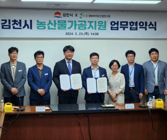 김천시가 23일 농업기술센터에서 (재)경북바이오산업연구원과 지역농산물을 활용한 우수 농식품 개발을 위한 업무협약을 체결했다.