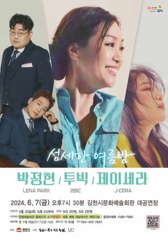 김천시 문화예술회관(관장 배정화)이 오는 6월 7일(금) 오후 7시 30분 문화예술회관 대공연장에서 ‘박정현&투빅&제이세라 콘서트’를 개최한다.
