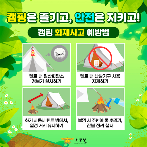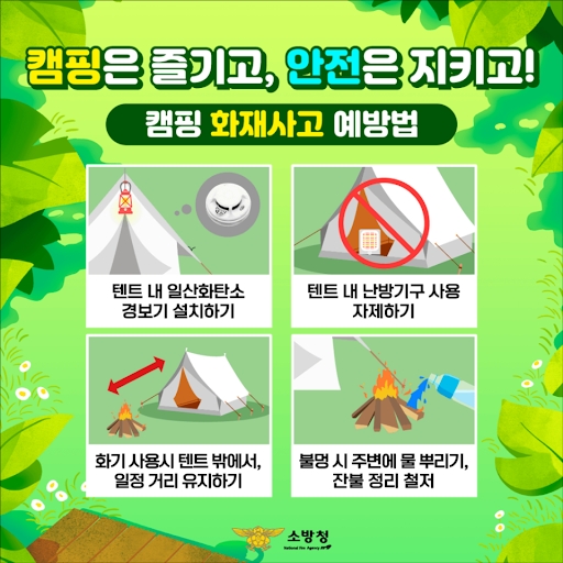 이에 구미소방서에서는 안전한 캠핑을 즐기기 위한 예방수칙으로 ▲ 반드시 지정된 장소에서 불 피우기 ▲ 작은 불씨라도 완전히 끄기 ▲ 가연성 소재인 텐트와의 안전거리 확보하기 ▲ 화재를 대비하여 소화기의 위치와 사용법 숙지하기 ▲ 텐트 안 환기구 확보하기 등 안전수칙을 준수해 줄 것을 당부했다.