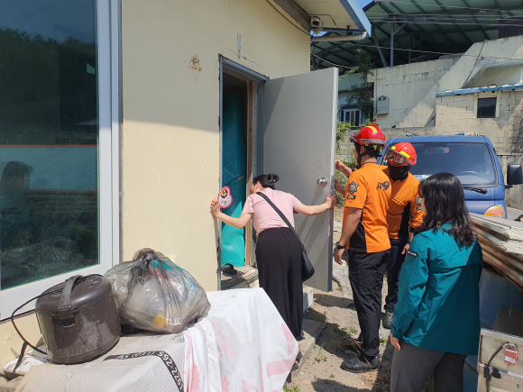 이날 훈련은 시간당 100㎜ 이상의 극한호우로 급경사지가 무너지고 마을이 침수되는 상황을 가정해 현장 주민 대피 훈련과 이재민 구호, 주민 대상 풍수해 행동요령 교육 등을 병행했다.