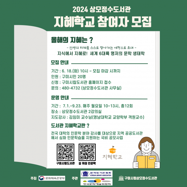 구미시립중앙도서관이 상모정수도서관과 양포도서관에서 운영하는 지혜학교 수강생을 18일부터 모집한다고 밝혔다.