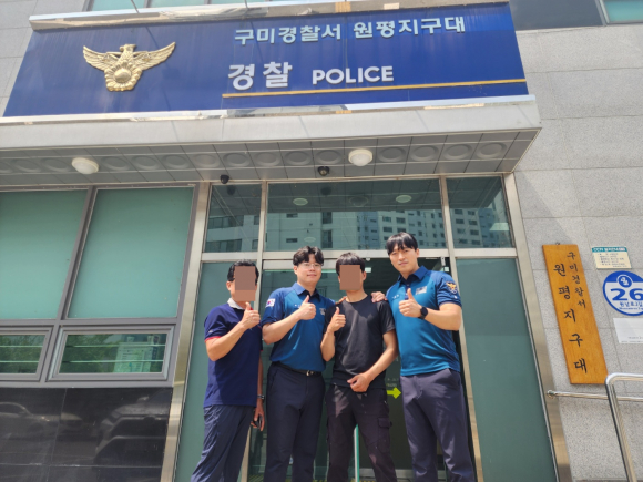 | ↑↑ 이승표 경위, 양인철 순경, 구호 시민과 가족 (구미경찰서 제공) |