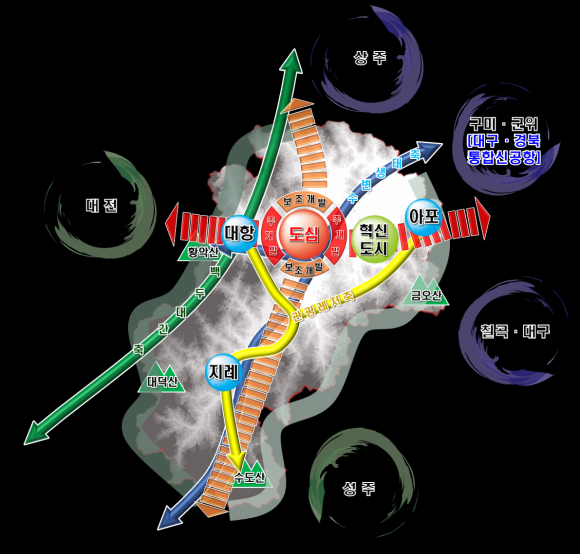 도시공간구조는 중심기능을 수행하는 도심지역을 1도심, 혁신도시를 중심기능 강화수행지역으로 1지구중심, 대항·아포·지례를 생활권별 중심기능을 수행하는 3지역거점으로 설정했다.