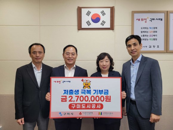 구미도시공사(사장 이재웅)가 25일 저출생 극복에 힘을 보태기 위해 성금 270만 원을 구미시에 전달했다. 전달된 성금은 경상북도의 저출생 극복을 위한 추진 재원으로 사용될 예정이다.
