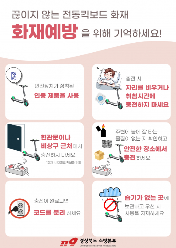 이에 따른 전동킥보드 안전수칙은 ▲안전장치가 장착된 인증 제품 사용하기 ▲충전 시 자리 비우지 않기 ▲취침시간에 충전하지 않기 ▲현관문이나 비상구 근처에서 충전 금지 ▲주변에 가연물이 없는 안전한 장소에서 충전하기 ▲충전 완료 시 코드 분리하기 ▲습기가 없는 곳에 보관하기 등이 있다.
