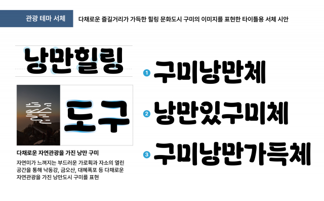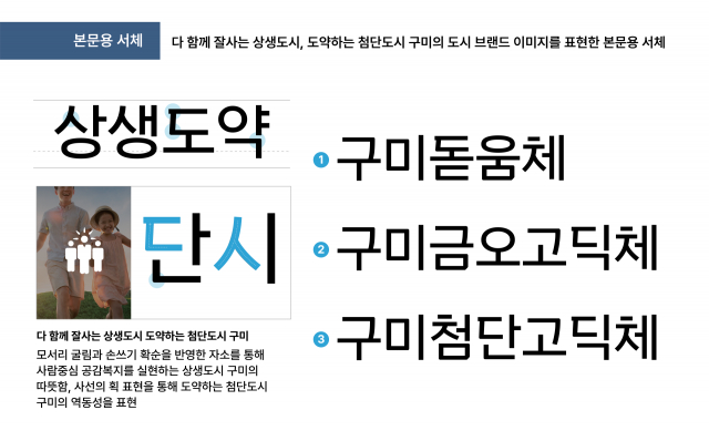 조사는 5일부터 14일까지 10일간 온라인으로 진행되며, 전 국민이 참여할 수 있다. 참여자들은 구미시청 누리집이나 네이버폼을 통해 서체별 후보안 3개 중 하나를 선택하면 된다.