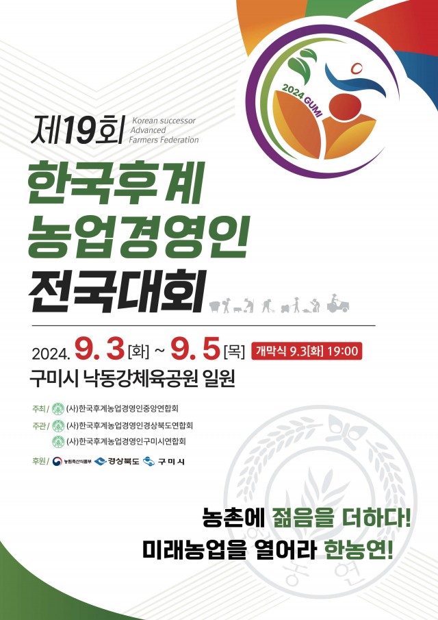 제19회 한국후계농업경영인 전국대회가 ‘농촌에 젊음을 더하다! 미래농업을 열어라 한농연!’을 주제로 9월 3일부터 5일까지 3일간 구미낙동강체육공원에서 개최된다.