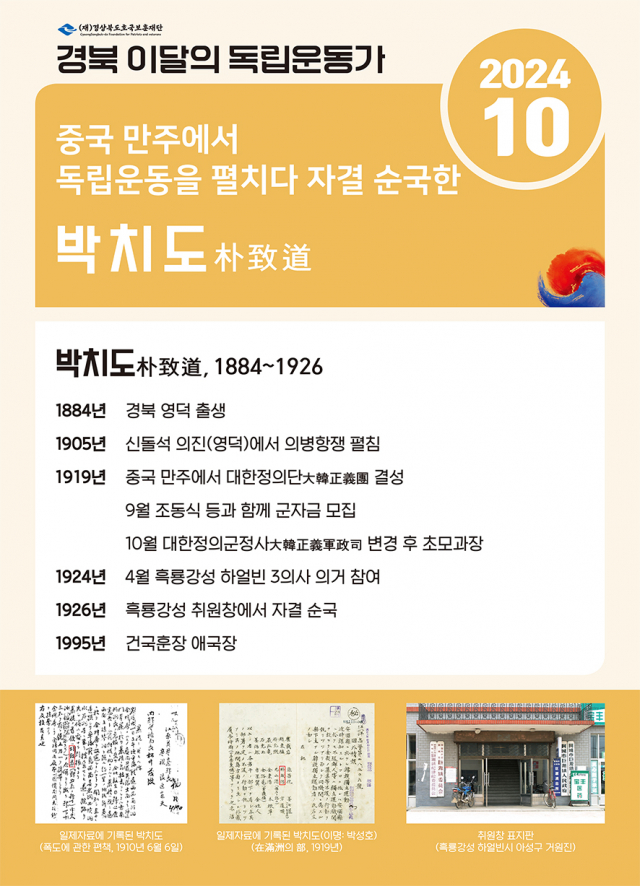 경북도호국보훈재단이 경북 10월의 독립운동가로 만주에서 독립운동을 전개하다 자결 순국한 영덕의 박치도를 선정했다.