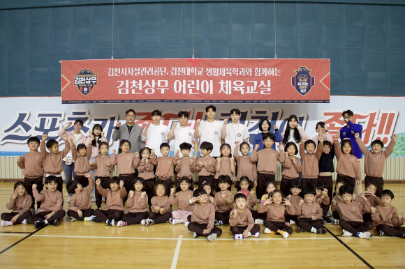 김천상무프로축구단(대표이사 배낙호)이 24일, 김천실내배드민턴장에서 금강사 금강유치원생 40명을 대상으로 어린이 체육교실을 열었다.