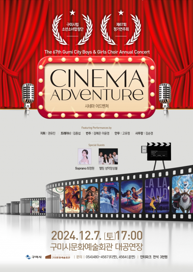 구미시는 구미시립소년소녀합창단 제67회 정기공연으로 ‘CINEMA ADVENTURE’를 12월 7일 오후 5시 문화예술회관 대공연장에서 개최한다.