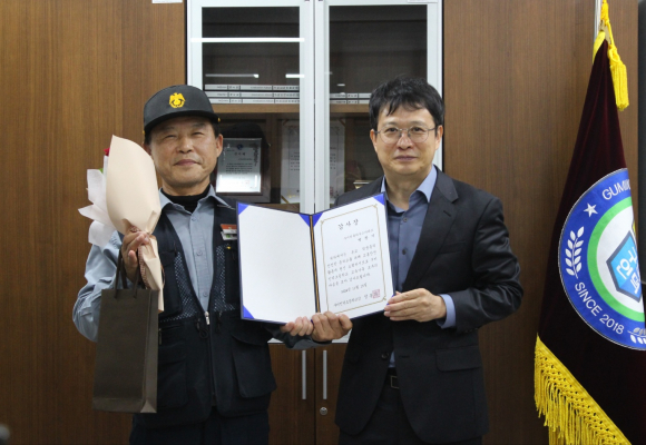 | ↑↑ 구미인덕초(교장 성봉기)가 교통봉사 경비원에게 감사장을 전달했다. |