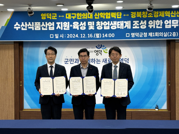 영덕군청에서 열린 협약식에는 김광열 영덕군수, 이문락 경북창조경제혁신센터장, 박수진 대구한의대 산학부총장, 이근우 영덕 로하스 수산식품지원센터장 및 관계자가 참석했다.