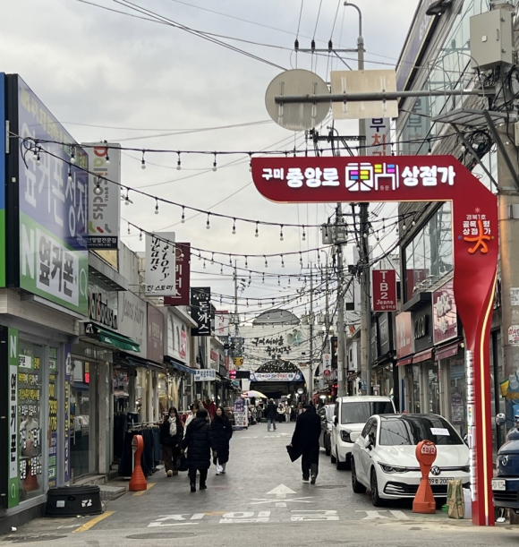 구미시가 경북 1호 골목형상점가로 지정된 중앙로 동문 상점가 입구에 야간조명과 함께 지주형 조형물을 20일 설치했다고 밝혔다.