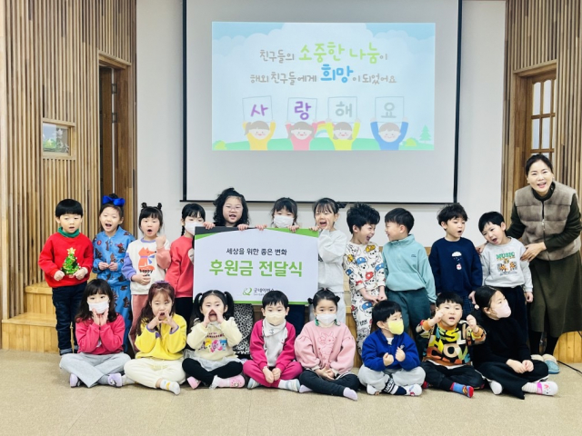 구미 킨더하바 유치원(원장 임명해)이 4일 지난해 12월 진행한 아나바다 바자회 행사 수익금을 굿네이버스 경북사업본부(본부장 박범근)에 전달했다.