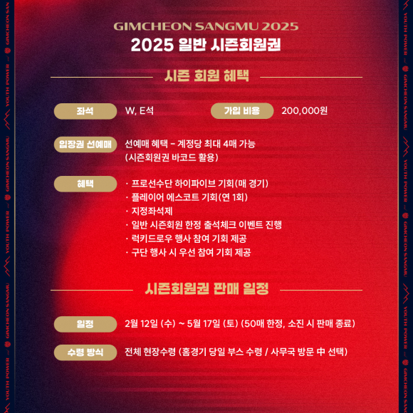 김천상무프로축구단(대표이사 이재하)이 오는 12일부터 5월 17일까지, 2025 시즌회원권 판매를 시작한다. 온라인 티켓링크와 구단 공식 홈페이지를 통해 가입이 가능하며, 일반 시즌회원 50매와 어린이 시즌회원 100매로 한정 판매된다.