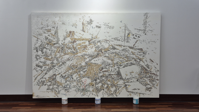 -회화, 콜라주 작가라고 소개했는데, 주로 어떤 작업을 하나?서양화과를 졸업했지만 유화로 작업한 적은 없습니다. 매체에 상관없이 종이를 오려 붙이거나 그린 것을 지우거나 가벼운 물감으로 우연적인 표현에 사실성을 보태는 정도의 표현을 주로 했고요. 전업 작가로 살던 시절에는 테이프 콜라주 작품이 작품성을 인정받아 테이프를 붙여서 풍경을 재조직하거나 떼어내서 흔적을 남기는 작업, 그리고 드로잉을 위주로 전시해 왔습니다. 무너지거나 부서진 ‘도시풍경’들을 보며 뭔가 강렬한 인상을 받았던 거 같아요. 대학 시절 재개발지역 근처에 살던 10여 년은 그것만을 소재로 작업했습니다. 구미에 살면서 지금은 ‘자연’을 주로 봅니다. 주름이 깊어가는 꽃, 독을 뿜어내지만 공기를 정화시켜주는 남천, 곧 철거될 문들...사실 그다지 예쁜 이미지들은 아니지만 변화의 순간들이 뭔가 경이롭습니다.