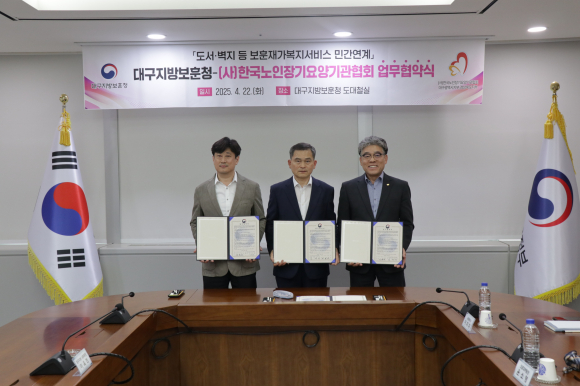 대구지방보훈청(청장 김종술)이 (사)한국노인장기요양기관협회 대구광역시지부(회장 김병덕)·경상북도지부(회장 나명현)와 도서·벽지 등 보훈재가복지서비스 강화를 위한 업무협약(MOU)을 체결했다.