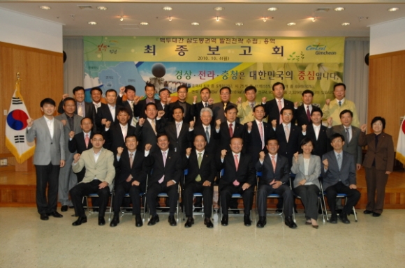 김천시는 4 시청 3층강당에서 김천․무주․영동 3시군의 화합과 상생의 지역발전을 위한 <백두대간 삼도봉(三道峯)권역 발전전략 수립>용역 최종보고회를 가졌다.