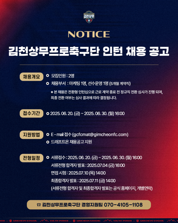 채용시험은 1차 서류전형과 2차 면접전형으로 이루어진다. 서류 접수는 6월 20일부터 30일까지이며, 구단 홈페이지에서 관련 서류를 다운로드 받아 작성 후 구단 이메일(gcfcmat@gimcheonfc.com)로 제출하면 된다. 또한, ‘드래프트온’ 웹사이트 채용공고를 통해서도 지원이 가능하다.