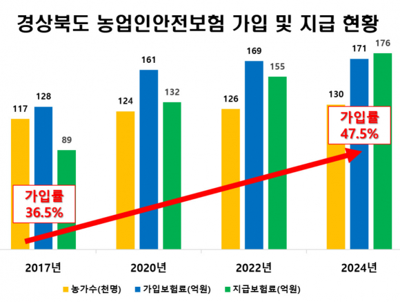 경북도는 2017년부터 농업인 안전 보험 가입을 지원해 가입률은 매년 꾸준히 증가하고 있다. 최근에는 보장 범위가 큰 ‘산재형’ 상품에 관한 관심이 높아지면서, 가입도 증가하는 추세이다.