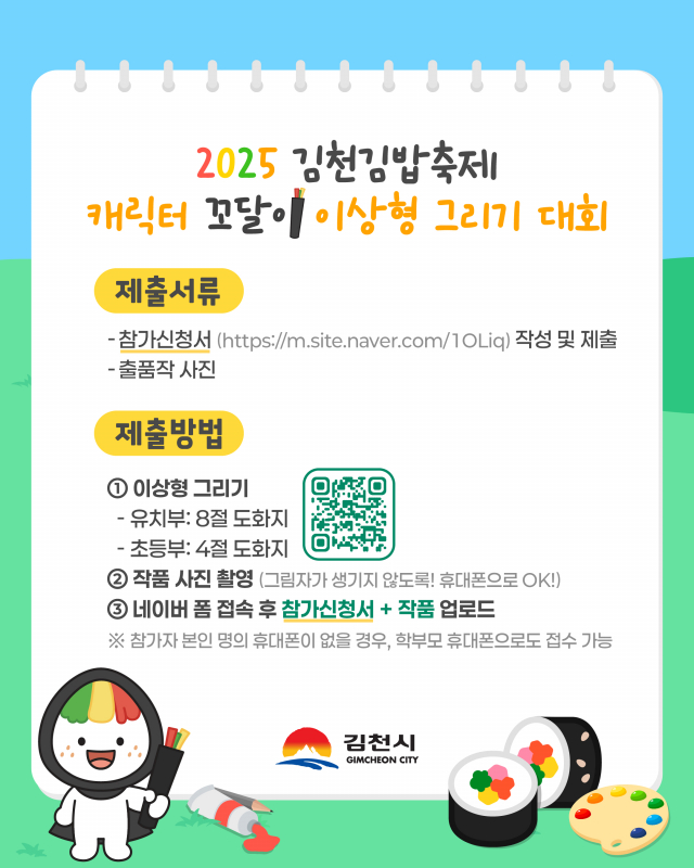 김천시가 10월 25일부터 26까지 열리는 김천김밥축제의 사전 분위기 조성과 홍보를 위해 ‘김밥축제 캐릭터 꼬달이 이상형 그리기 대회’를 개최한다.