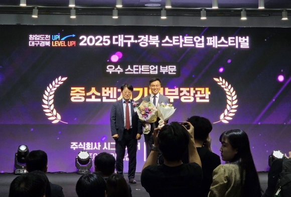 | ↑↑ (주)알에프온(대표 조경래)이 지난 25일 대구창조경제혁신센터에서 열린 ‘2025 대구경북 스타트업 페스티벌’ 행사에서 우수 스타트업 부문 ‘중소벤처기업부장관상’을 수상했다.(오른쪽 조경래 대표, 금오공대 제공) |