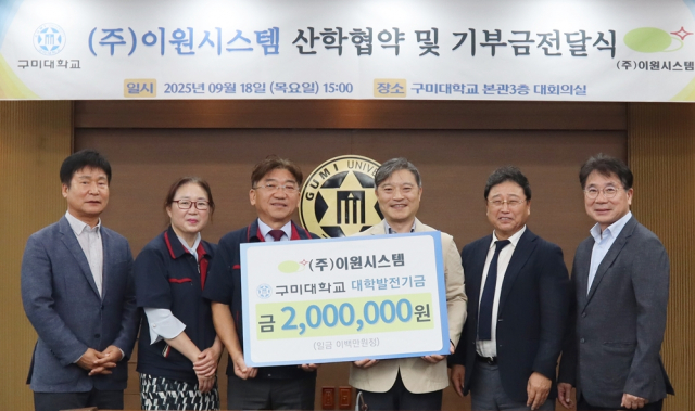 구미대학교는 ㈜이원시스템(대표이사 이문원)이 대학 인재 양성을 위한 발전기금 200만원을 전달했다고 30일 밝혔다.