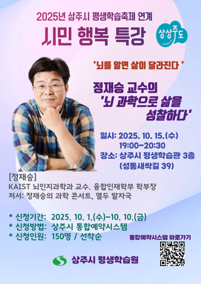 이번 특강은 2025년 상주시 평생학습축제와 연계해 ‘뇌 과학으로 삶을 성찰하다’라는 주제로 열린다.