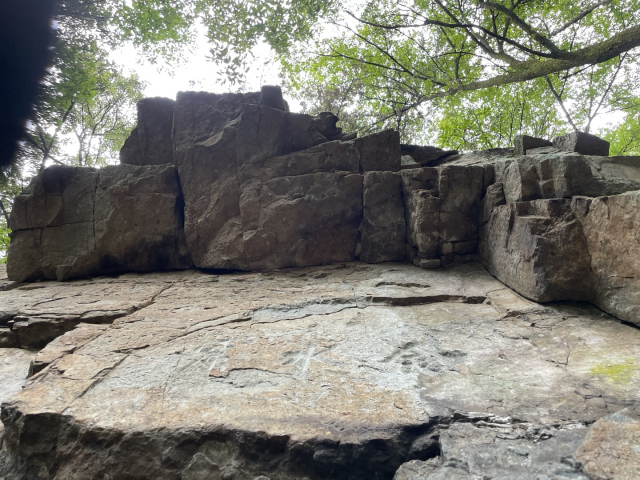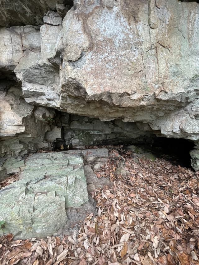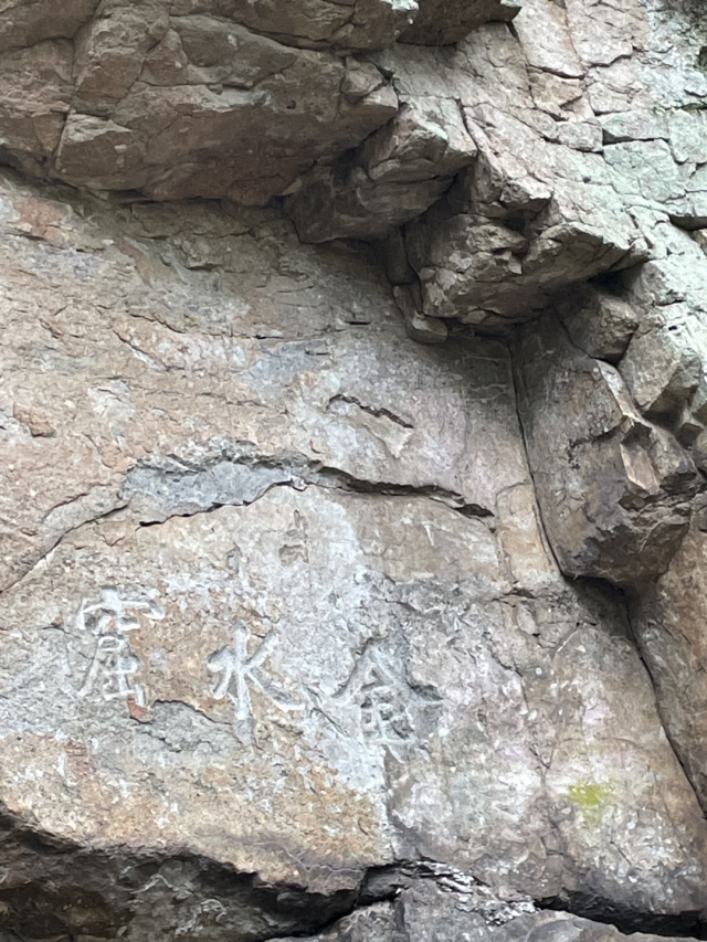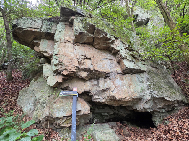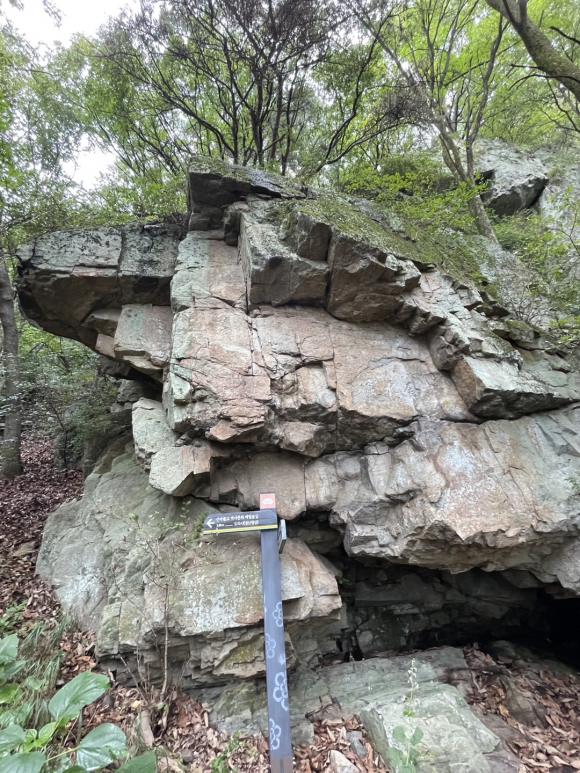 고행(苦行)의 길 끝에 마침내 금수굴(金水窟)을 마주했다. 주변을 압도하는 거대한 바위는 세월의 흔적이 느껴질 만큼 거칠고 층층이 갈라져 있었다. 마치 거대한 사각형 블록들을 켜켜이 쌓아 올린 것처럼. 표면은 밝은 황갈색 또는 옅은 회색을 띠었지만, 그늘지고 습한 부분은 청록빛 이끼로 뒤덮여 있었다. 바위 아래에는 어둡고 작은 동굴 입구가 있었다. 오른편 안쪽으로 깊숙이 파인 그곳은, 오랜 이야기를 품은 듯 신비로웠다. 고개를 들어 다시 바위를 올려다보니 바위에 새겨진 선명한 글씨, 金水窟이 눈에 들어왔다. 굴속의 물빛이 황금빛을 띤다 하여 붙은 이름, 그리고 이곳에서 아도화상이 머물렀다는 전설이 문득 스쳤다. 이렇게 낮고 조그마한 곳에 과연 사람이 머물 수 있었을까. 의문을 품은 채 축축한 흙냄새가 스며드는 깊은 동굴 속을 들여다보았다. 문득, 돌에 새겨진 시간 속에서는 어쩌면 가능했을지도 모른다는 숙연한 생각이 일었다.