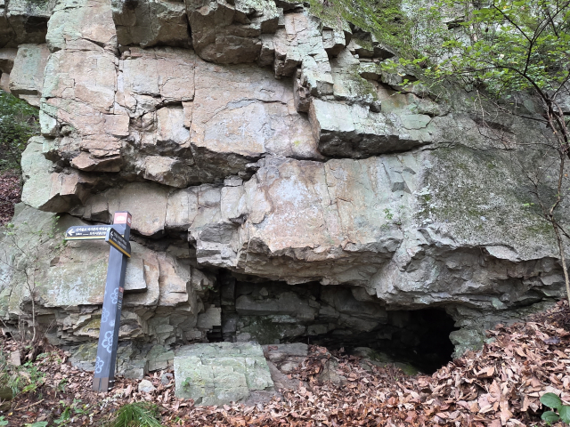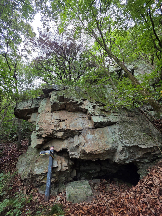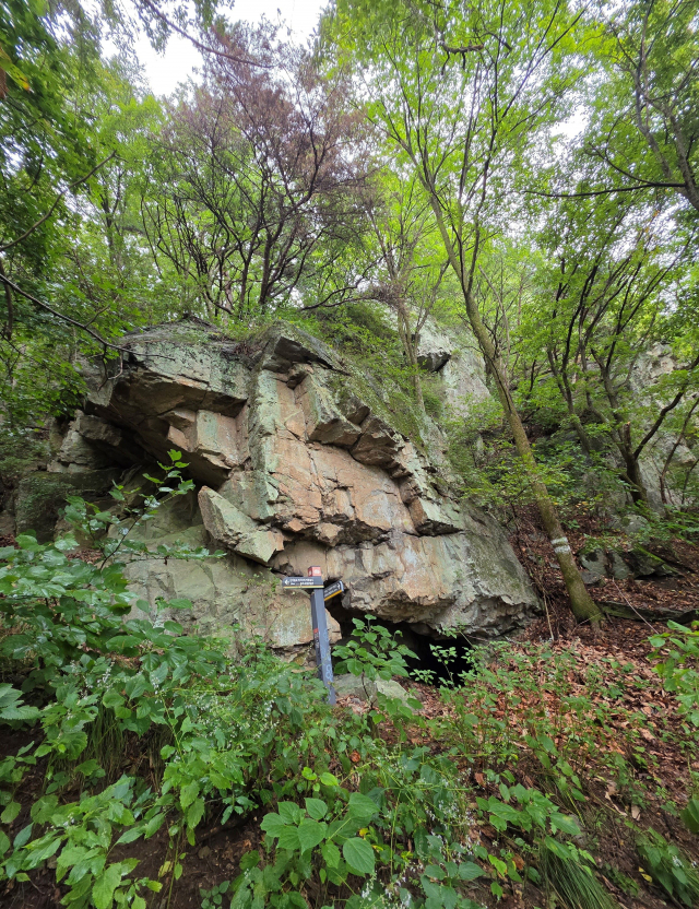 냉산 정상부쯤에서 냉산성의 성곽 흔적을 확인하고 산을 내려오는 길에, 그동안 텍스트로만 보아왔던 금수굴을 만났다. 금수굴은 신라에 불교를 처음 전파한 아도화상이 열반에 드신 곳으로 알려져 있다. 금수굴은 냉산정 진입로에서 약 400m 떨어진 냉산 서쪽 돌벼랑에 자리 잡고 있다. 진입로와의 거리는 가깝지만 이곳으로 향하는 길은 만만치 않다. 경사가 워낙 급해 발을 디딘 계단에서도 밧줄을 잡고 내려가야할 정도다. 표지판에 쓰인 문구처럼 그야말로 '고행(苦行) 길'이었다.