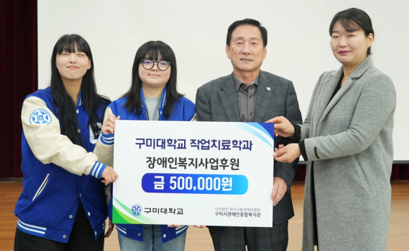 지난 12일 구미대 작업치료과는 구미시장애인종합복지관에 50만원의 기부금을 전달했다. 기부금은 재학생들이 지난 9월 구미시 4개 대학 어울림 페스티벌에서 학과 체험 부스를 운영해 발생한 수익금과 11월 교내 캡스톤 경진대회에 수상한 상금을 모은 것이다.