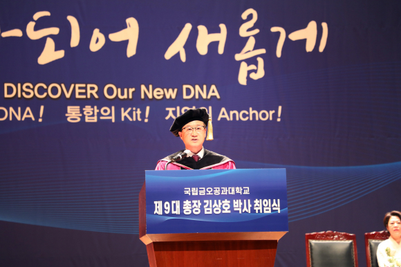 취임식에서 김상호 총장은 “국립금오공과대학교는 대한민국 산업 발전의 중심에서 공학 인재를 길러내며 지난 50년 동안 국가와 함께 성장해 온 자랑스러운 역사를 지니고 있다”며 “이제 ‘하나 됨’과 ‘새로움’으로, 미래를 향한 혁신·연대와 통합·개방·소통의 DNA를 발굴해 구성원의 집단지성과 혁신역량을 하나로 모으고, 이를 바탕으로 대학의 새로운 성장 동력을 만들어가겠다”고 밝혔다.