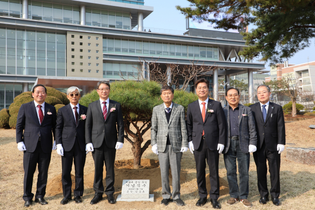 | ↑↑ 김상호 총장(왼쪽에서 세번째)이 역대 총장 및 곽현근 발전후원회장 등과 기념식수를 했다.(국립금오공대 제공) |
