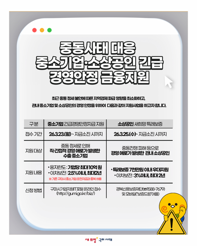 구미시가 중동 지역 정세 불안에 따른 글로벌 공급망 차질과 원자재 가격 상승 등으로 경영 애로가 우려되는 지역 중소기업과 소상공인을 지원하기 위해 긴급 경영안정 금융지원을 추진한다고 22일 밝혔다.