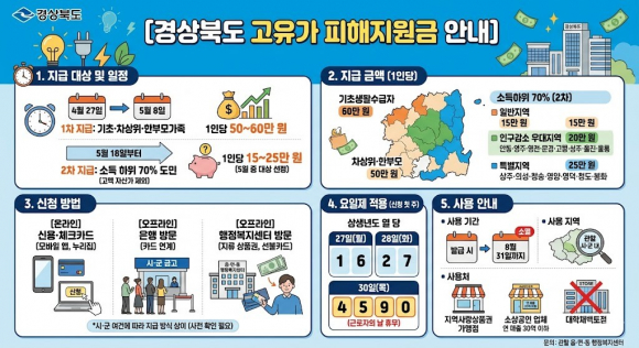 경상북도가 고유가·고물가로 인한 도민 생활 부담을 완화하고 지역경제에 활력을 불어넣기 위해 이달 27일부터 ‘고유가 피해지원금’ 1차 지급을 시작한다.