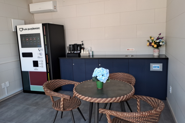 카페 내부에는 최신 캡슐커피 자판기와 에이드, 차(Tea) 등 다양한 음료를 비대면 결제 시스템으로 간편하게 이용할 수 있도록 했다. 커피 한 잔은 2,500원이다.