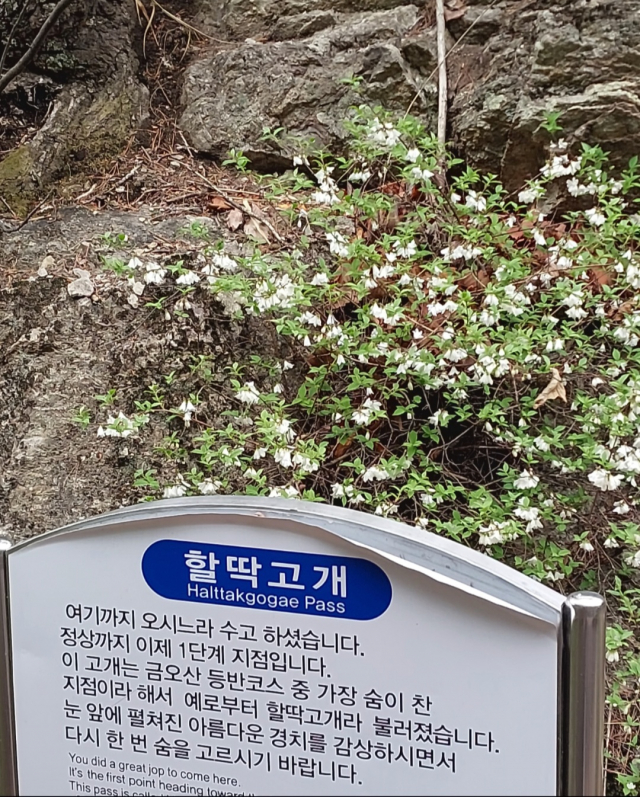 오늘 여정의 마지막 구간은 이름부터 숨이 차오르는 ‘할딱고개’다. 가파른 나무 데크 계단이지만, 양 옆을 살피며 천천히 오르니 핀곤함이 덜하다. 바위 아래 하얗게 핀 꽃들을 더러 보았지만, 여기에서는 더 자주 눈길을 끈다. ‘매화말발도리’꽃이다. 그러더니 ‘할딱고개’ 표지판 위에서도 이 꽃이 태연하게 자리잡고 있었다.