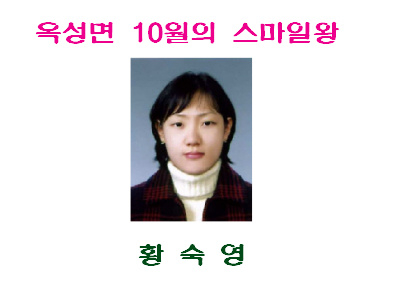 이번 10월의 스마일 왕으로 선정된 황숙영씨는 회계, 통계업무를 맡고 있으며 옥성면의 살림을 책임지고 있으며, 언제나 밝고 긍정적인 성격으로 민원인에게 웃음을 전해주고 있다.