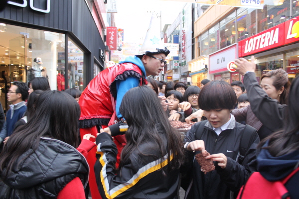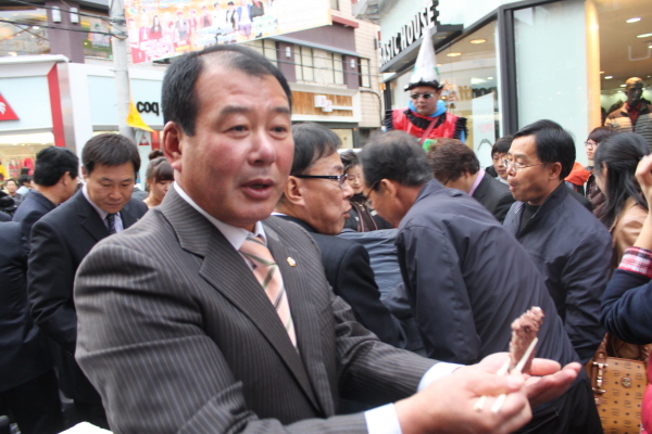 » 떡 드세요. 시민들에게 떡을 나누어 주는 김재상 문화로 발전협의회 전직 회장(구미시의원) |