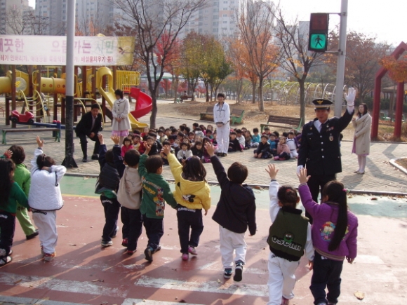 이날 교육은 공원 내 설치된 교통신호등과 횡단보도를 이용, 안전한 길 건너기 체험과 바깥놀이 주의사항 등을 아이들 눈높이에 맞게 재미있게 설명했다.