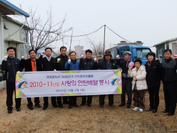 국제로타리 3630지구 구미로타리클럽(회장 문연진)은 지난 2일 구미시 고아읍 양호리 김원식(47)씨외 10세대를 방문해 ‘사랑의 연탄배달 봉사’를 펼쳤다.