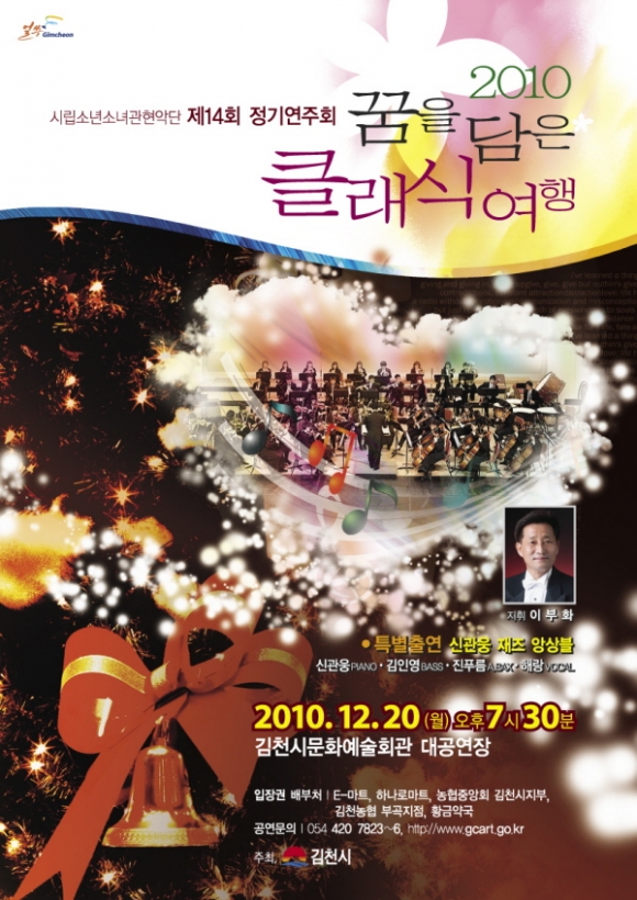 김천시립 소년소녀 관현악단(지휘자 이부화)의 제14회 정기연주회 ‘꿈을 담은 클래식 여행’이 오는 월 20일 오후 7시 30분 문화예술회관에서 열린다