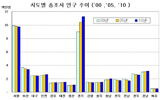 특히 경기도는 전체 인구의 23.4%인 1천127만명이었으며, 서울이 20.1%인 9백70만8천명, 부산이 7.1%인 340만 3천명, 경남이 6.5%인 315만4천명이었다.
