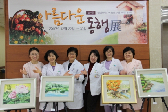 순천향대학교 부속 구미병원 교직원들로 구성된 순수회(회장 안지영 진단검사의학과 교수)회원들이 자신들이 손수 그린 작품들을 모아 병원 로비에서 제1회 아름다운 동행전이라는 전시회를 가졌다.